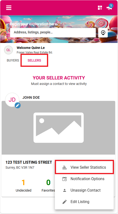 From the Sellers tab, click the three-dot menu and select View Seller Statistics to see detailed activity and performance insights for your listing.